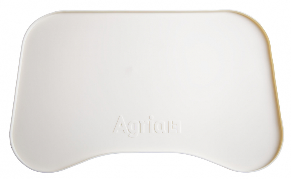 Silikonmatte for hunde- og katteskåler. Laget av 100 % silikon, avtørkbar og enkel å rengjøre. Beige farge med Agria-logo. Beskytter gulvet mot søl.